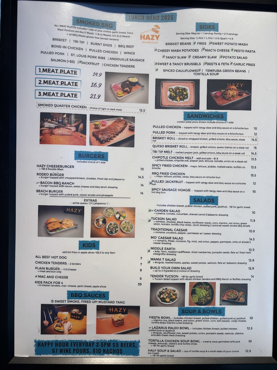 At Hazy Barbecue, the star of the show is undoubtedly the smoky, tender meats that are crafted with care. Indulge in their Brisket ($14.50) or Tri-Tip ($14.50) for a savory bite that promises a delightful smoke ring and juicy texture that melts in your mouth. If you're in the mood for something with a kick, the Spicy Andouille Sausage ($6 per link) is a must-try. For those who revel in fall-off-the-bone perfection, the Pork Ribs come in a range of sizes, making them ideal for sharing or indulging solo. Each rib is succulent and glazed to perfection, offering an aromatic sensation that lingers long after the last bite. Don't forget to explore their BBQ Sampler, which includes a delicious mix of brisket, pulled pork, chicken, ribs, and sausage – perfect for those who want to experience a little bit of everything.