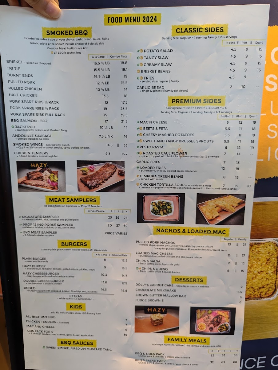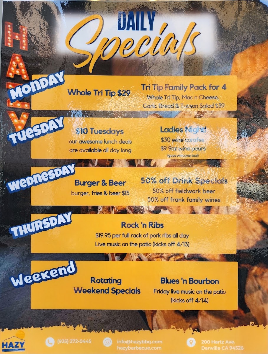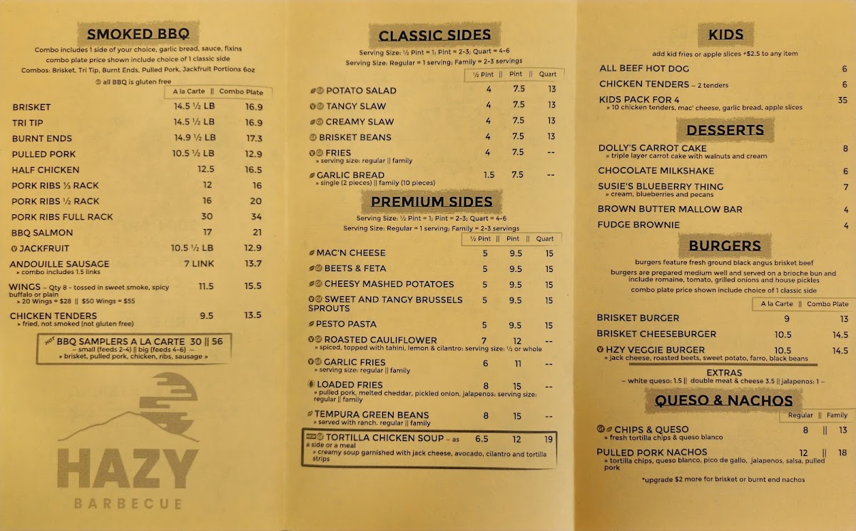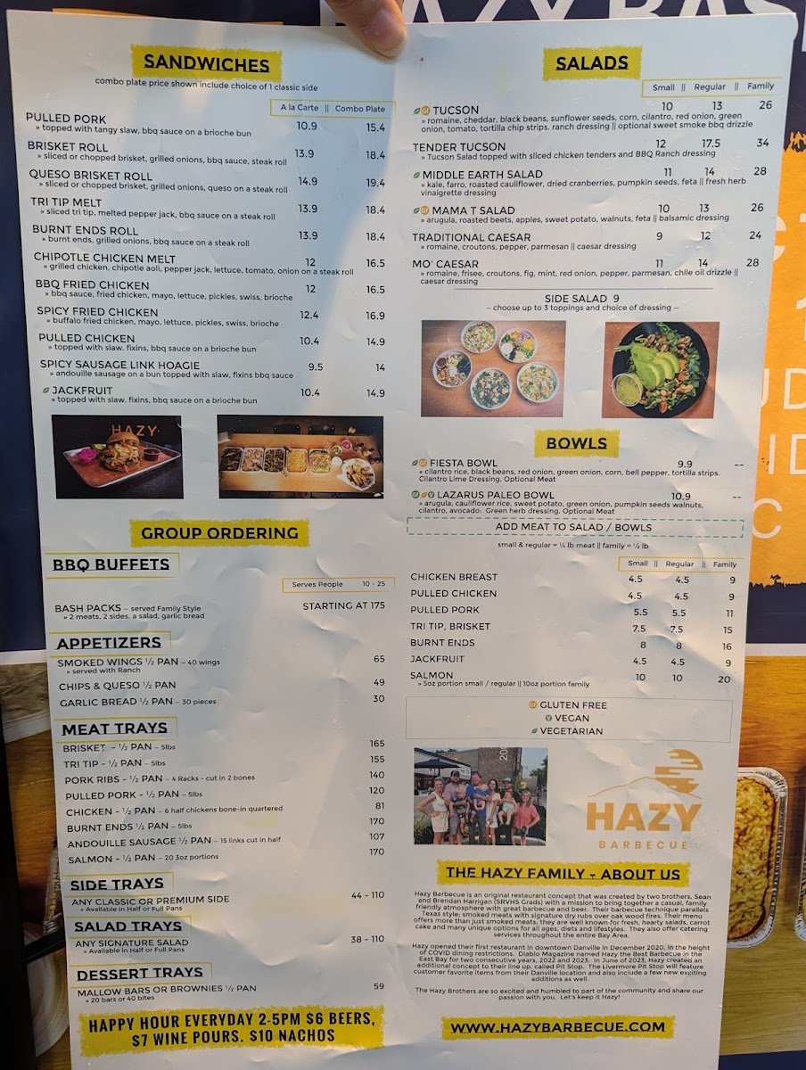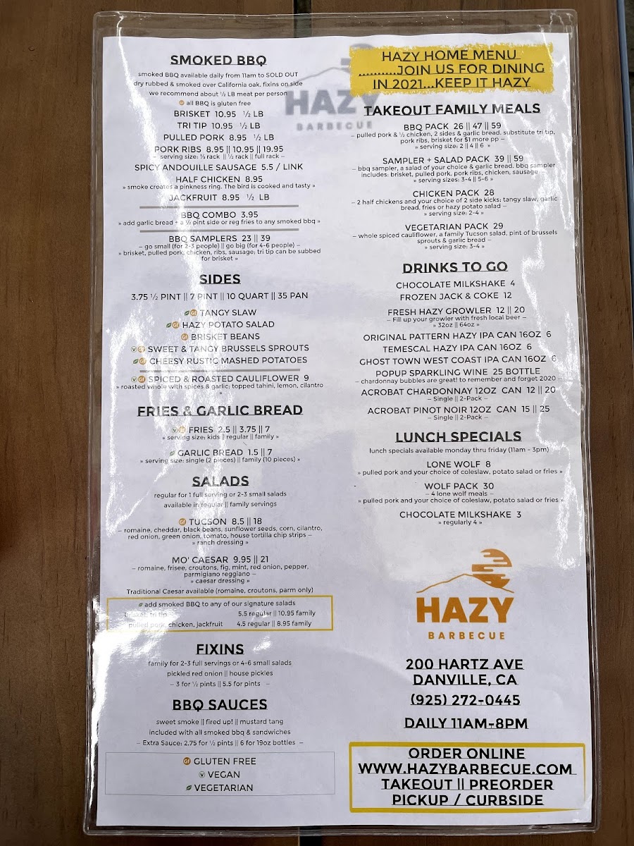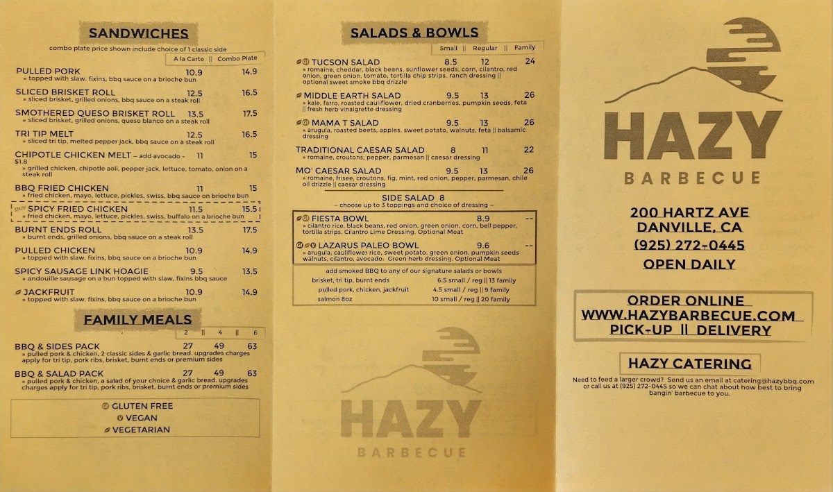 Welcome to Hazy Barbecue, a barbecue lover's paradise nestled in the heart of Danville, California. Located at 200 Hartz Ave, this vibrant eatery is known for serving mouthwatering, smoked barbecue dishes that keep locals and visitors alike coming back for more. With a busy, inviting atmosphere that is both modern and clean, Hazy Barbecue offers the perfect setting for a casual lunch or a satisfying dinner with friends and family.